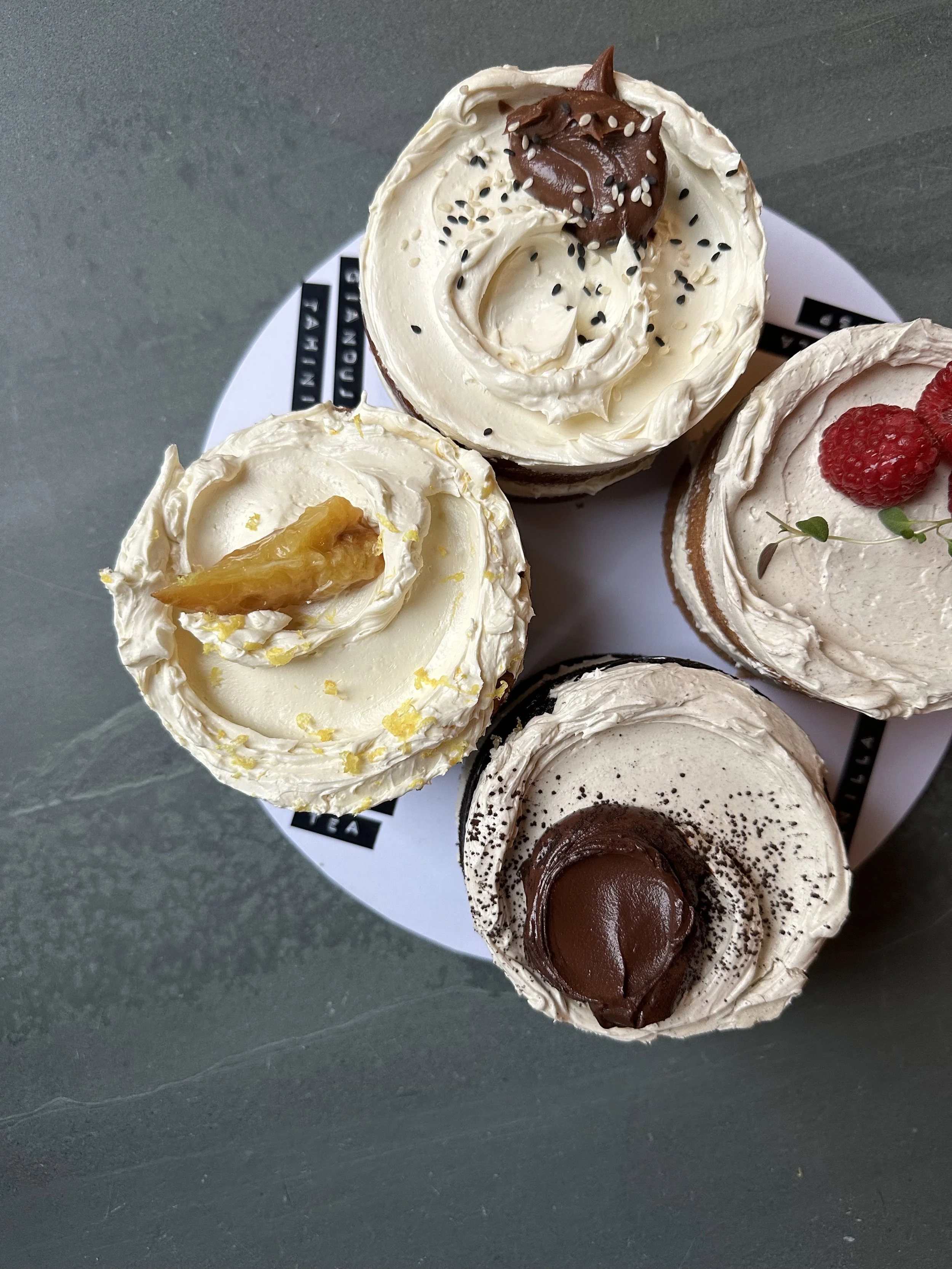 Brown sugar sponge, gianduja ganache, tahini drizzle & a tahini meringue buttercream